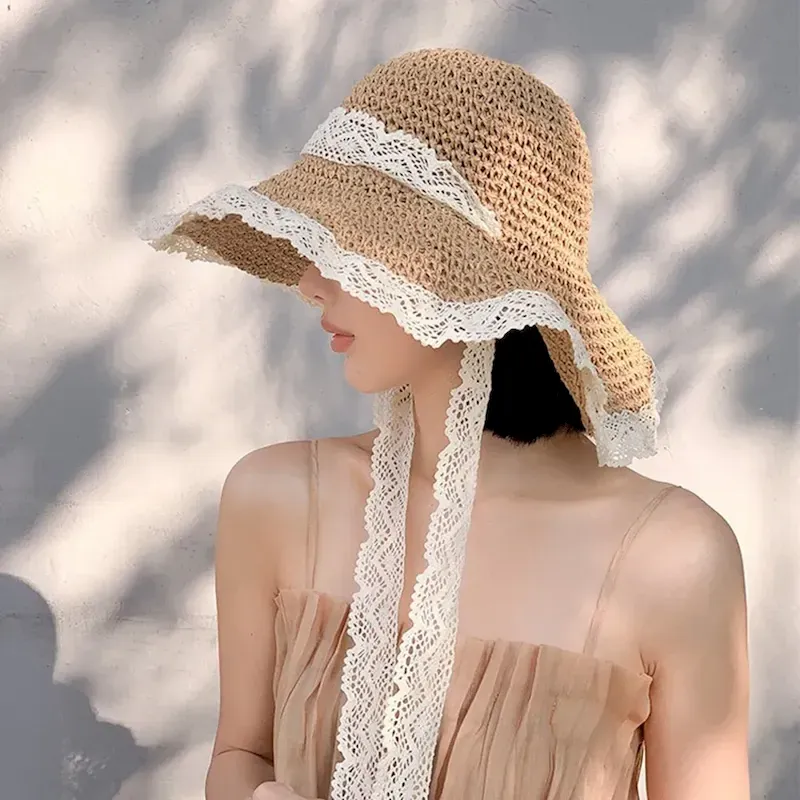 Elegant Beige/Khaki Straw Hat With Lace Lanyard Wide Brim Ruffle Sun Hats Breathable Travel Beach Hats For Women Girls Summer Outdoor Holiday 2025 – U